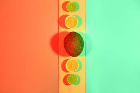 Tasty fruits and coconut on color background