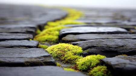 Close-up of pavement stones with green moss growing in between, illustrating the beauty of nature reclaiming urban spaces.