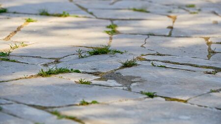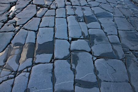 A close-up view of a cracked and weathered stone pavement, revealing the texture and age of the surface.