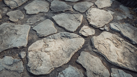 This outdoor pathway features a close up view of rough uneven stone tiles scattered across the ground illuminated by the warm glow of the late afternoon sun. The stones vary in size and texture showcasing natural colors ranging from beige to gray with some exhibiting subtle striations. The interplay of light and shadows accentuates the rugged edges creating an organic aesthetic that suggests a rustic charm