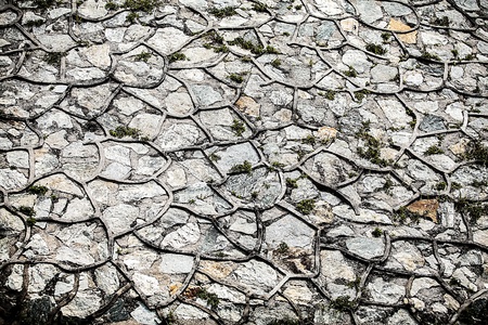 Cracked stone surface with moss growing in the crevices