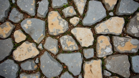 Rustic cobbled walkway with mossy stones in earthy hues creating a charming aged look