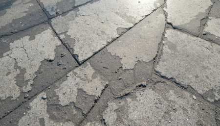 Cracked and damaged concrete pavement reflects urban decay under bright sunlight.