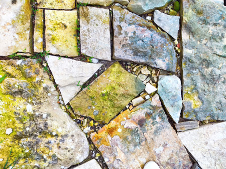 Old floor of wild stone with green moss in the seams, sunny day
