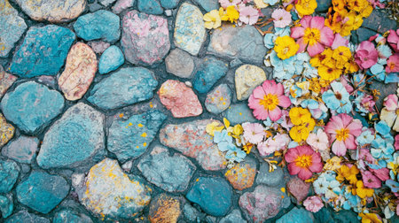 Vibrant Floral Carpet on Stone Street Creating a Lively Summer Mosaic Concept of Nature's Art, Colorful Walkways, Urban Gardening.