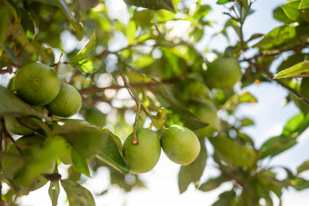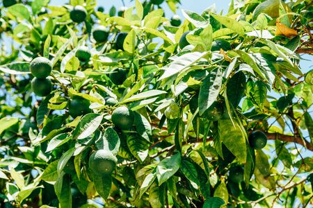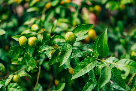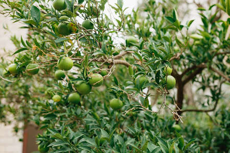 Unripe green tangerines hang on the tree in the orange orchard.
