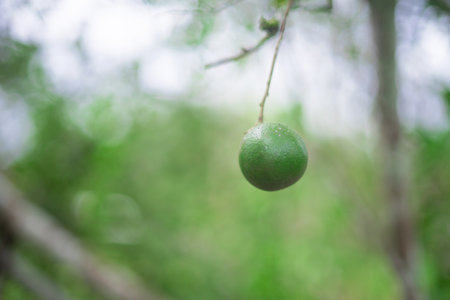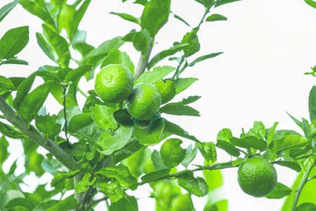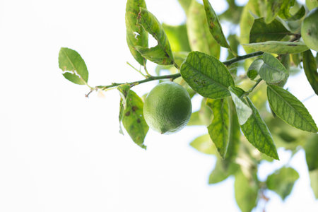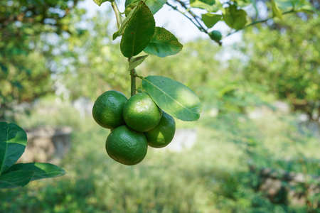 Green lemons is citrus fruits on a branch with nature background. Green Lemons tree in the garden with daylight. Fresh green lime fruit hanging from branch.