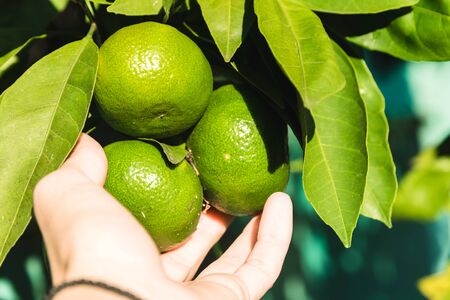 Fresh Oranges Fruits in the Garden , Close up on Hand Picking View of the first person, hand holds green tangerines.