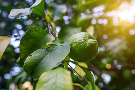 Fresh green lemon limes on tree in organic garden