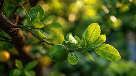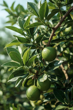 Close-up of a lime tree branch with glossy green limes and healthy dark leaves. Soft background highlights the fruit's texture and ripeness. Perfect for culinary, botanical, or agricultural themes.