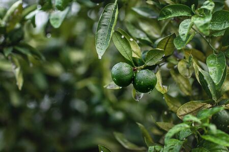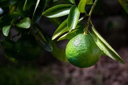 Close up detail lime green, lime green in the garden. Fresh green lemon limes on tree in organic garden.