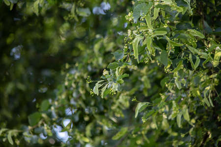 Linden flowers on a tree. Close up of linden blossom. Blooming linden tree in the summer forest.