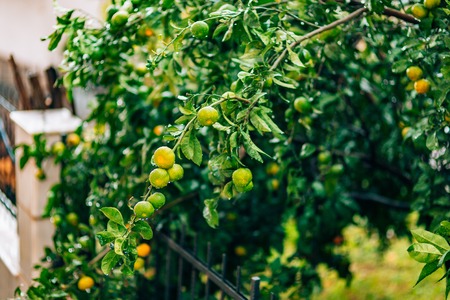 Ripening on the tree a tangerine. Montenegrin mandarin trees. Home tangerine garden. A lot of fruit on the tree. Not yet ripe.
