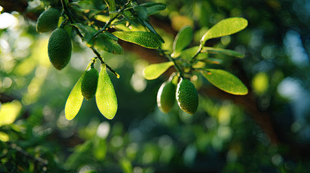 The Finger lime in spring, fresh green leaves, soft sunlight filtering, vibrant atmosphere full of vitality, natural textures, serene mood.