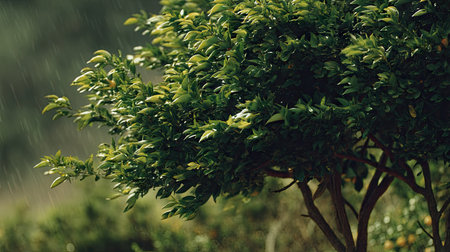 A detailed photograph of a single Citrus tree, swaying gently in the wind, captured in natural daylight. Fresh and airy atmosphere, soft motion blur on leaves, crisp details on textures, background softly blurred into natural greenery, cinematic natural light, realistic photography style.