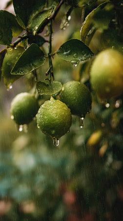 Soft rain falling gently on Desert lime, with water droplets forming and slowly dripping. The background is softly blurred with natural, moody atmosphere.