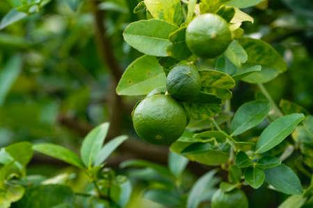 Green limes on a tree / Fresh lime citrus fruit in the garden farm agricultural with nature green blur background