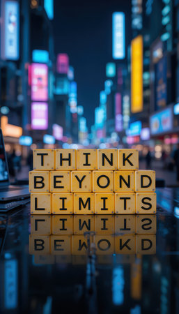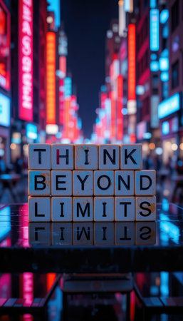 A vibrant city scene featuring a motivational message, Think Beyond Limits, illuminated against a backdrop of colorful neon lights, inspiring creativity and ambition.
