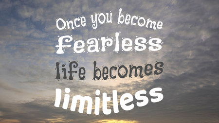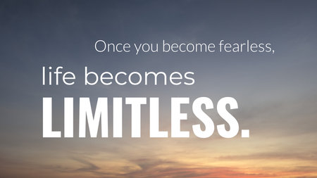 A stunning dawn sky with a blend of soft gray and orange colors. The text "Once you become fearless, life becomes limitless" is prominent in bold white font.