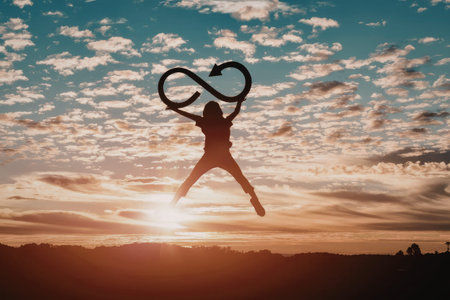 A person is captured in silhouette against a vibrant sunset, holding an infinity symbol above their head. The sky is filled with wispy clouds, and the sun is setting on the horizon, casting a warm glow over the scene.