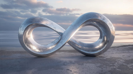 Abstract surreal background with infinity symbol mirrors sunset colors on a tranquil beach, evoking peace. Generative AI