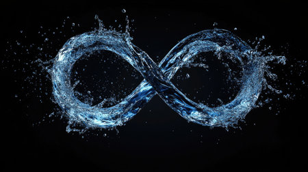 This striking image depicts a splash of water forming an infinity symbol, set against a dark background. It embodies the concepts of continuity and flow in nature.