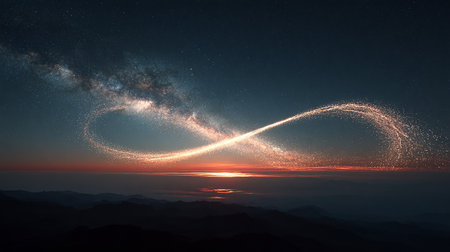 A vibrant infinity symbol glows with neon lights against a starry night sky, symbolizing eternity and the infinite possibilities of the universe.