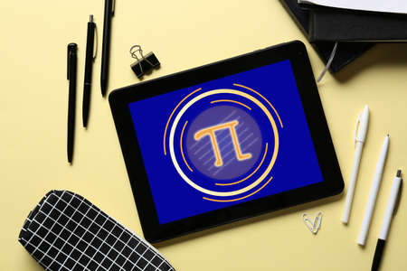 Modern tablet computer and school stationery on table. International Pi Day