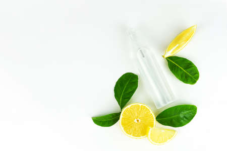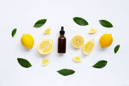 Fresh lemon with lemon essential oil on a white background.