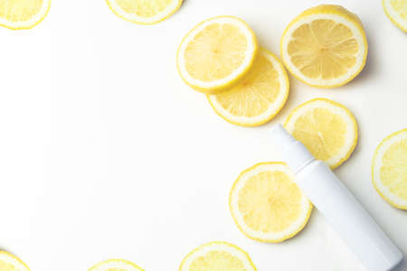 Creative summer skincare minimalistic background with fresh lemon fruit slices and bottle mist spray refreshing cosmetics. copyspace.