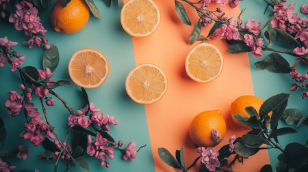 Creative flat lay of halved lemons and pink flowers on a vibrant orange and teal background, symbolizing freshness, beauty, and natural products.