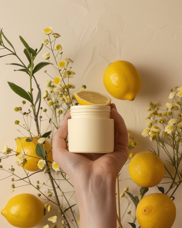 A hand holds a creamy jar with a lemon slice atop, surrounded by vibrant yellow lemons and delicate flowers, creating a refreshing and elegant aesthetic for skincare.