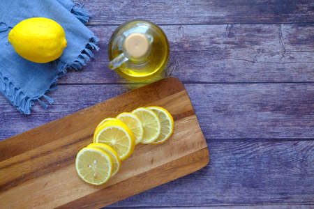Yellow sliced lemon on wooden board with copy space. Cutting citrus fruit on kitchen