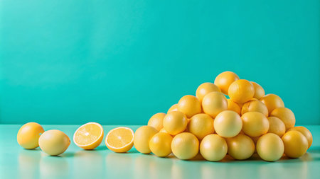 A pyramid of lemons against a turquoise backdrop, with a few lemons and a halved lemon in the foreground.