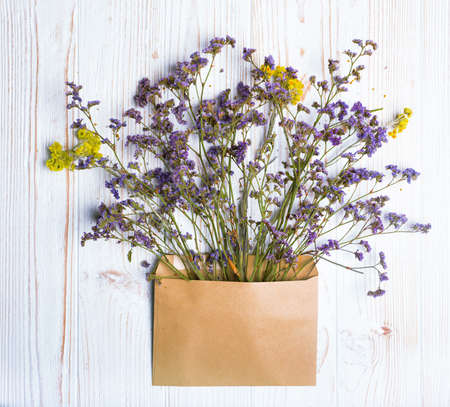 Colorful statice limonium flowers in paper bag. Old wooden table. Close up.