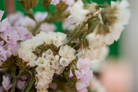 Bouquets of white and purple statice flowers at the market close up. Beautiful floral background. Top view.Selective focus