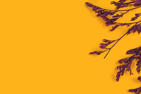 Flat lay composition with dried flowers and branches on yellow background, concept of minimal workspace with copy space
