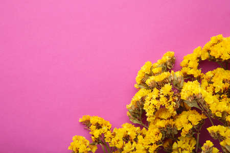 Flowers composition. Yellow gypsophila flowers on pink background. Spring, summer concept.