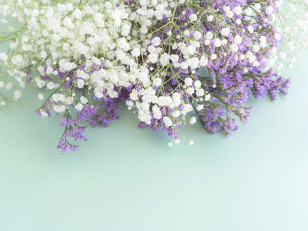 Flowers composition. Gypsophila flowers on purple background. Spring, summer concept. Flat lay