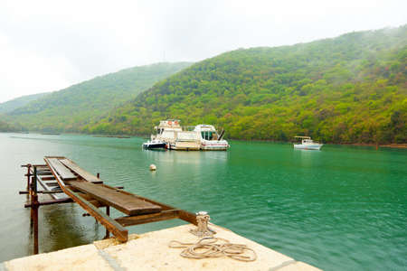 Jetty with motor boats on the Lima Canal in Croatia. Shooting from a drone.