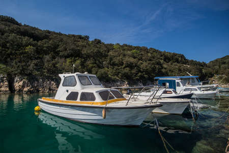 A small amount of old boats is moored in a picturesque bay or small marina on the island of Krk, Croatia on a sunny day.