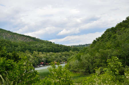 Landscape in Croatia: Timberland, river and blue sky with clouds