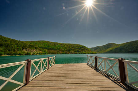 Beautiful landscape overlooking the lake next to the highway and forest with green trees in croatia