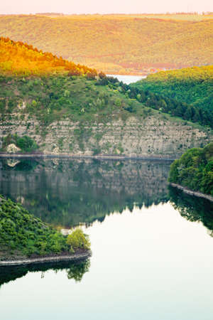Sunset landscape in the national nature park Podilski Tovtry, canyon and Studenytsia river is tributary of Dnister river, view from above.