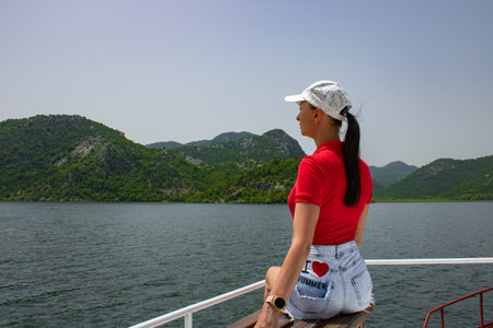 Close-up slender woman in red clothes and white cap. Big lake, mountains and blue sky in the background. Happily relax in vacation from work.