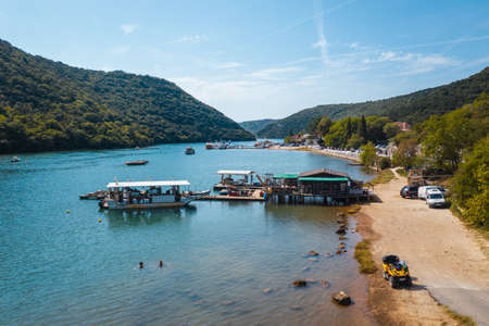 Marina with moored boats near oyster farm in Lim bay. Water flowing into Adriatic sea and surrounded by high mountains covered with forest. Aerial view