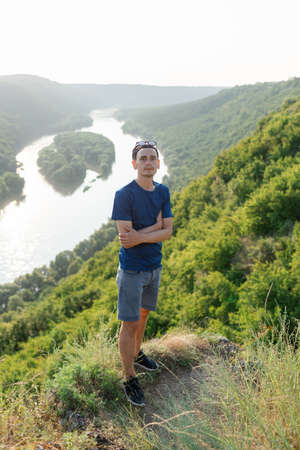 Portrait of a tourist in the background of the river with a small island. vacation concept
