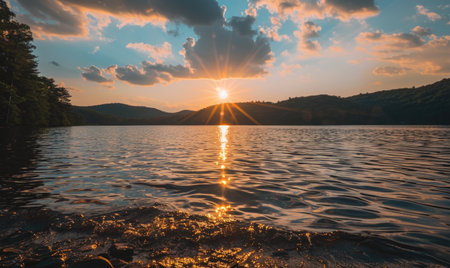 A stunning scene of a calm river reflecting a colorful sunset, surrounded by vibrant forests and mountains. The soft light creates a tranquil atmosphere perfect for relaxation.
