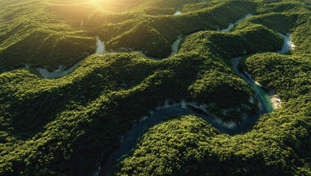 An overhead view captures a dense green landscape featuring winding waterways. The image showcases a vibrant display of textures and forms, illuminated by sunlight. This composition suggests a natural environment, suitable for editorial and commercial applications. The focus is on the visual aspects of the terrain.