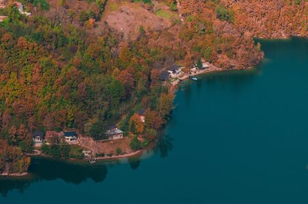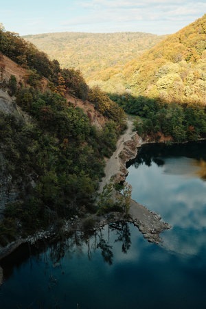 Beautiful view of Ledinci Lake surrounded by colorful autumn forest in Fruska Gora National Park Serbia